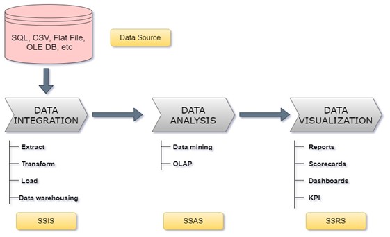 1. SSIS (SQL Server Integration Service) – Perform data integration and transformation tasks. It integrates the data from various data sources and performs integration for data warehousing. Data warehouse is used for storing data from various sources.